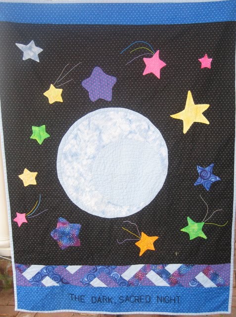 These are images of a reversible quilt I made for my grandson for his baby quilt (first grandchild). The quilt came from the song (and children's book) "What a Wonderful World" lyrics by George David Weiss and Bob Thiele, sung by Louis Armstrong. The illustrations in the picture book are by Ashley Bryan. My son enjoys Louis Armstrong and when I saw the illustrations for this book I knew this was the quilt to make for his first baby. Good Friend Marilyn does my math for me and these are almost identical to the page in the book. It's one of my favorite quilts and everytime I see it I marvel at how I took on a project like this. It was my very first foray into "go-without-a-pattern." The moon, you can't see it very well in the photo, is a crescent inside a full moon, two different fabrics.